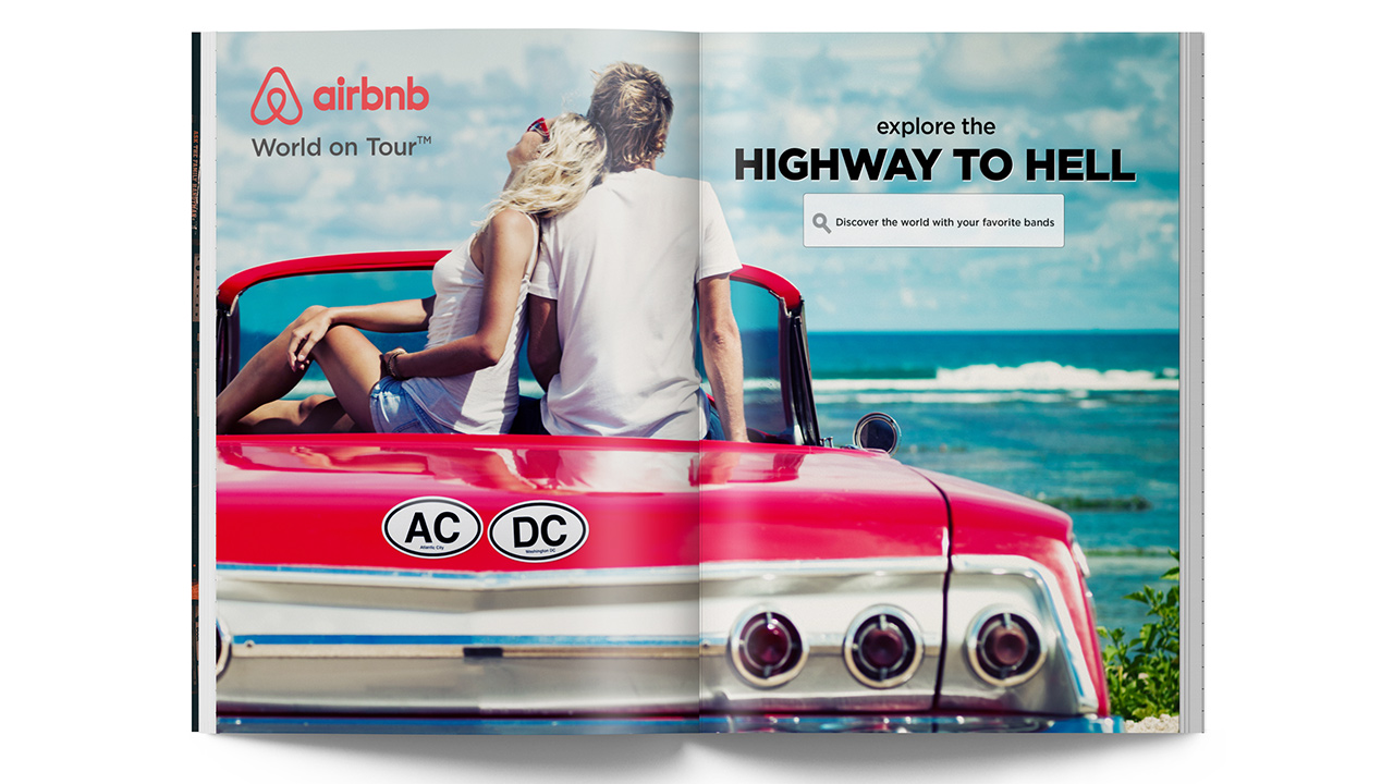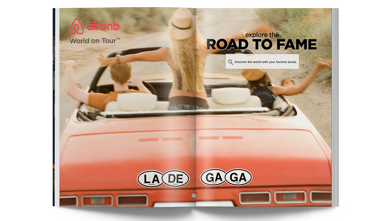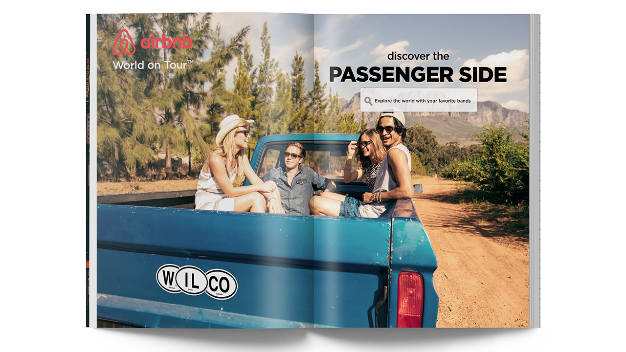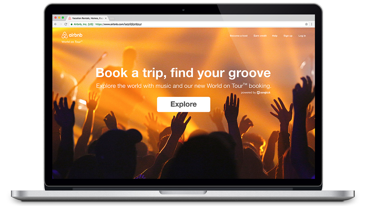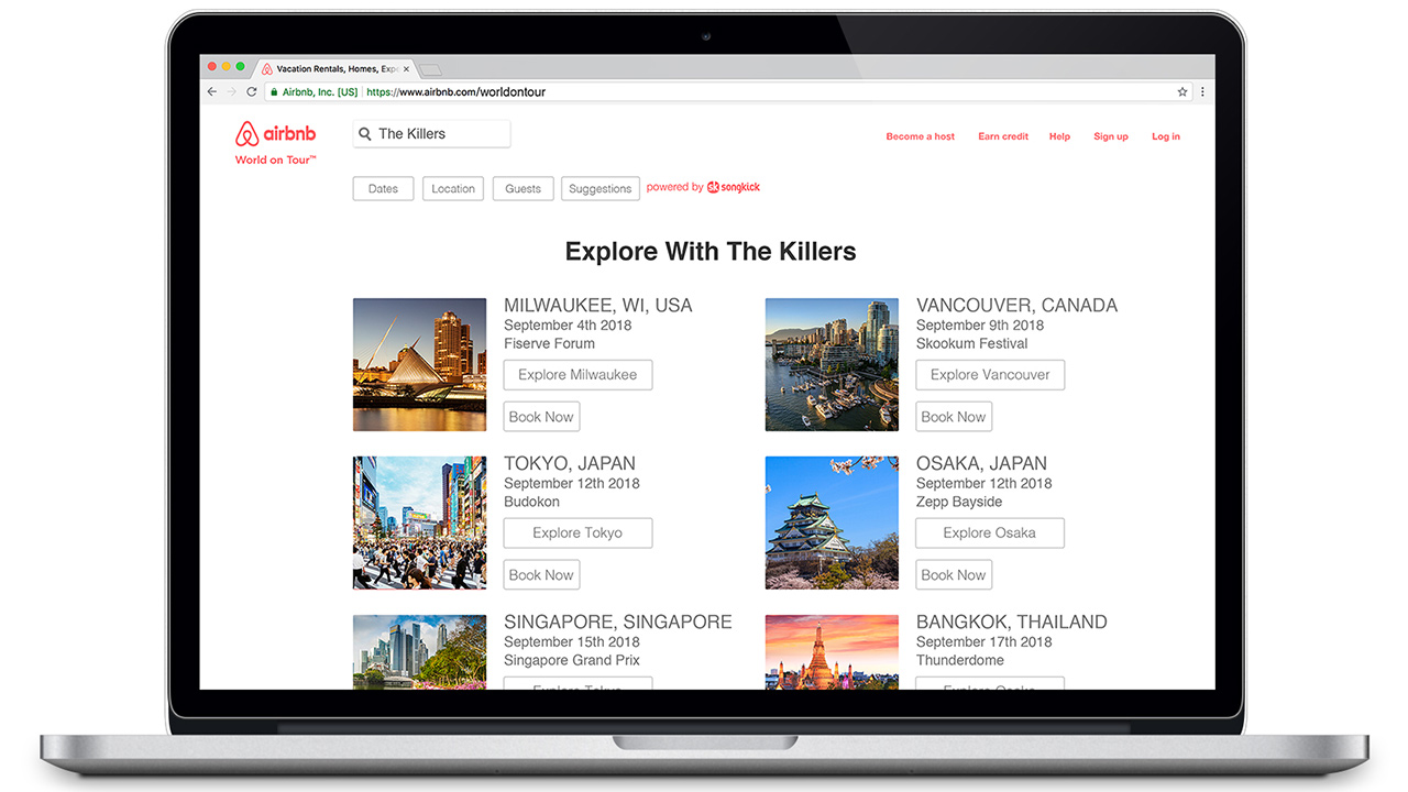 Using the Airbnb world on tour website people search or browse for bands they love to discover travel destinations and Airbnb rooms according to that band's concert schedules. The music concert discovery app Songkick will partner with Airbnb so that travelers can also be notified if a band they like is traveling to a city they want to visit.