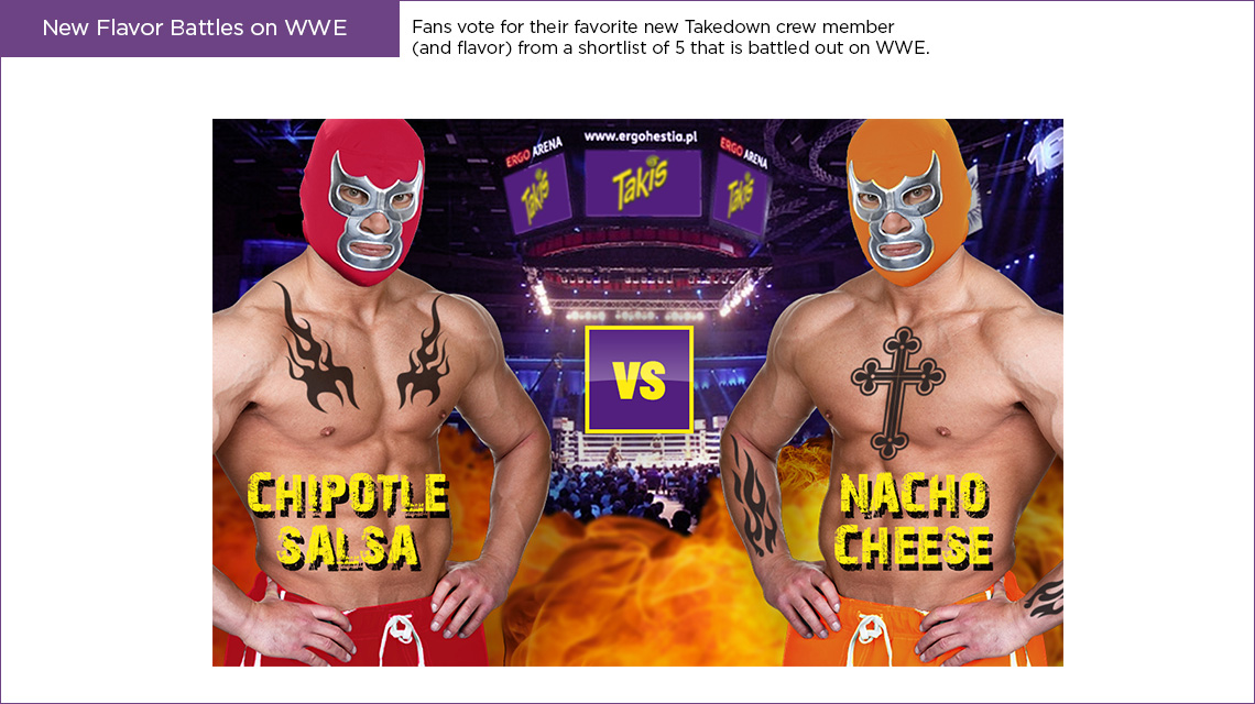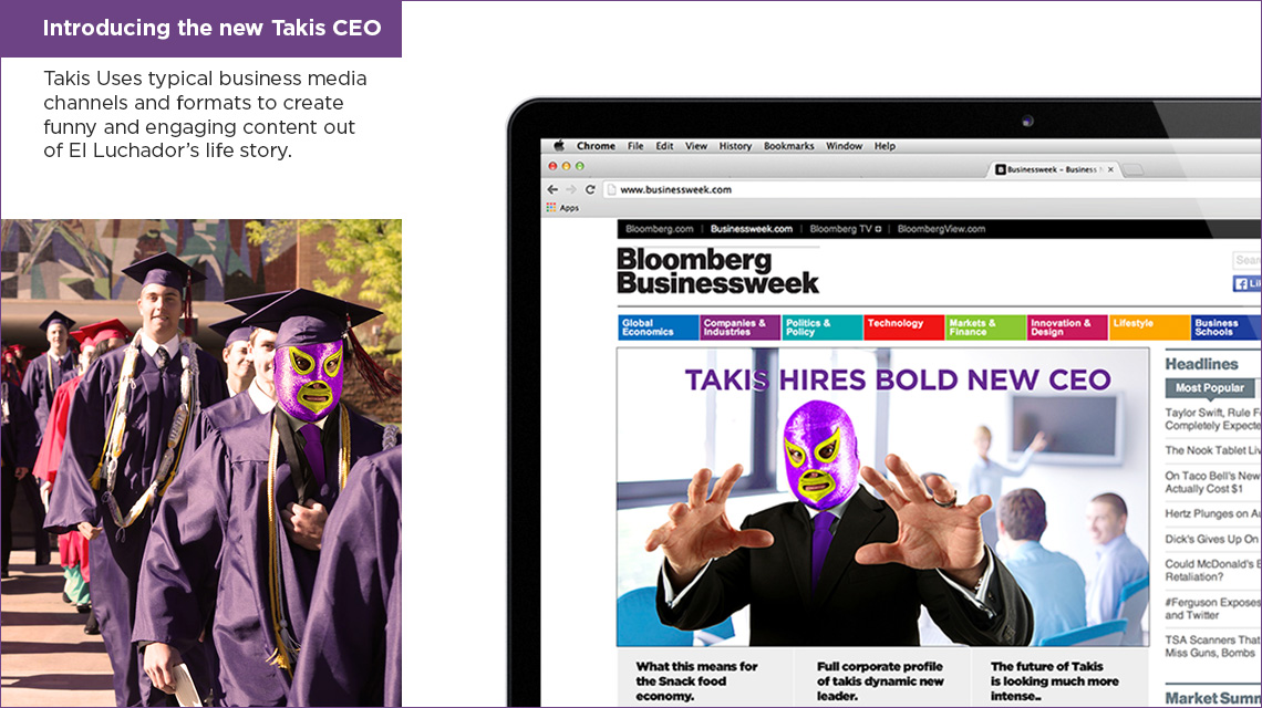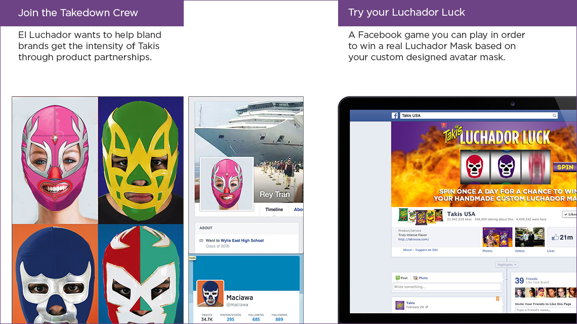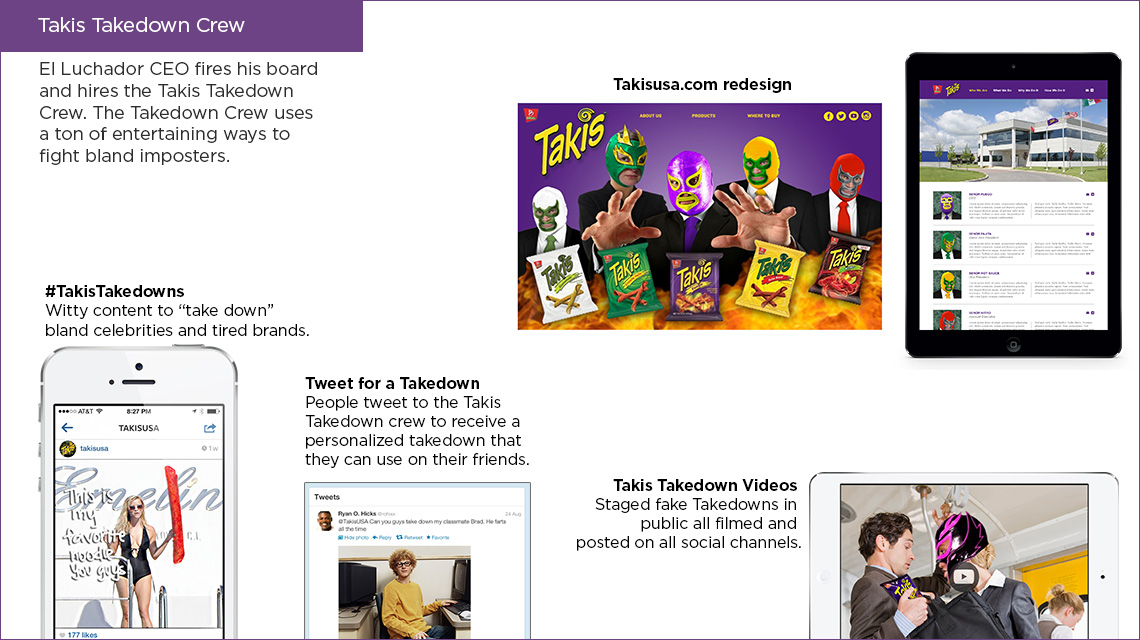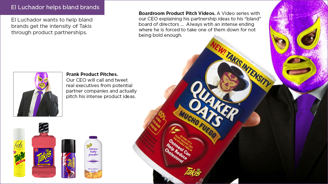A long lasting, broad reaching campaign based around Takis hiring a Luchador as their CEO. El Luchador CEO is as bold, intense, and authentically Mexican as their snack chips and his business solutions lead to an endless supply of super fun, fast, adaptable, and inexpensive material for Takis to use in social media as well as opportunities to leverage their existing relationship with the WWE wrestling league.
